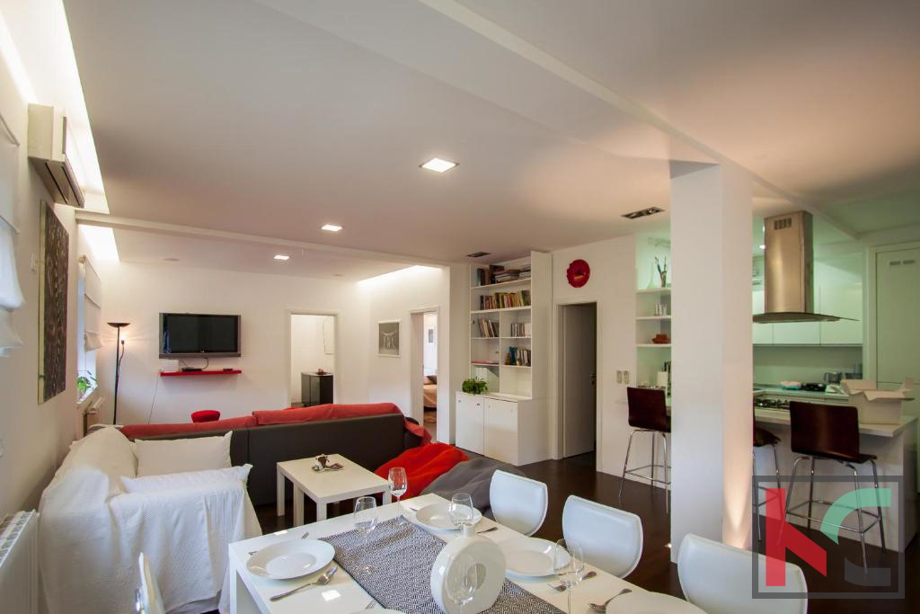 Prodaje se moderno uređen i kompletno renoviran stan na Vidikovcu. Smješten je u prizemlju manje novogradnje. Odličnog je tlocrtnog rasporeda ukupne stambene površine 110,07 m2. Sastoji se od ulaznog hodnika, dvije spavaće sobe, dnevnog boravka s kuhinjom