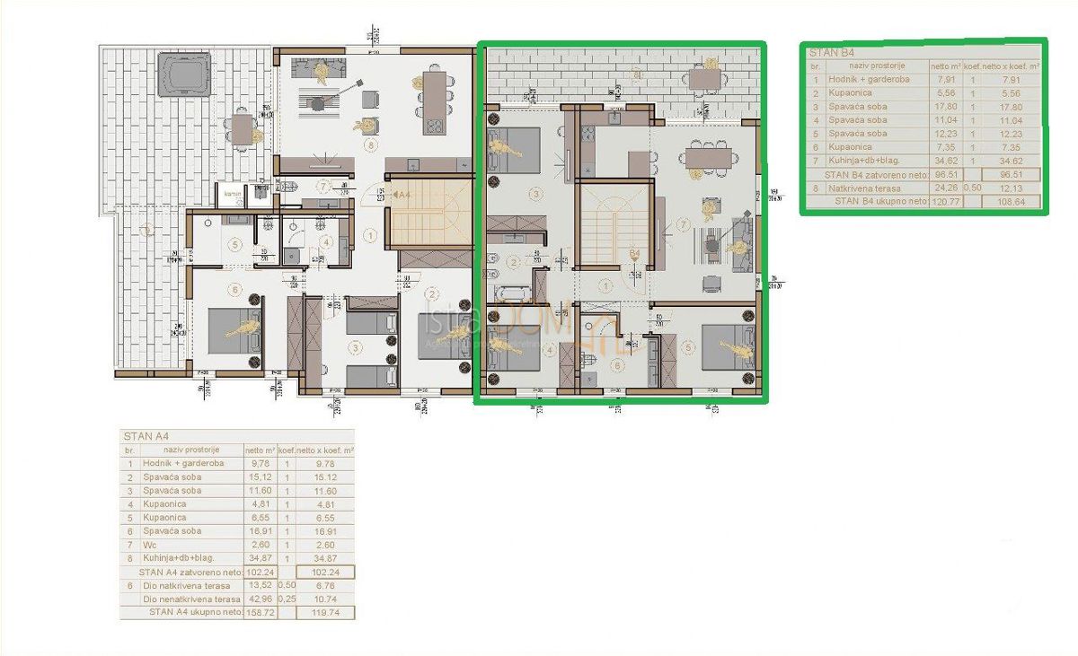 Stan se nalazi na drugom katu moderne zgrade sa samo četiri stana, što pruža dodatnu privatnost i mir. Sastoji se od predsoblja, tri spavaće sobe, dva kupatila, kuhinje s dnevnim boravkom i izlazom na terasu, što omogućava uživanje u vanjskom prostoru. Uz