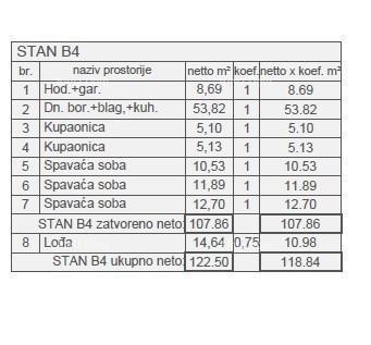 Novo u prodaji! Prodajemo lijepi stan u modernoj novogradnji u Štinjanu, sa pogledom na more. Stan B4, površine 122.50 m2 (neto površine 118,56 m2) se nalazi na 2.katu stambene zgrade B i sastoji se od ulaznog hodnika, dnevnog boravka, blagovaone i kuh